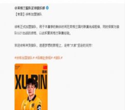 体育播报01月30日宣 英超球队狼队官方消息,U23国足队长、21岁青岛西海岸中场徐彬自由身转会加盟。徐彬转发...